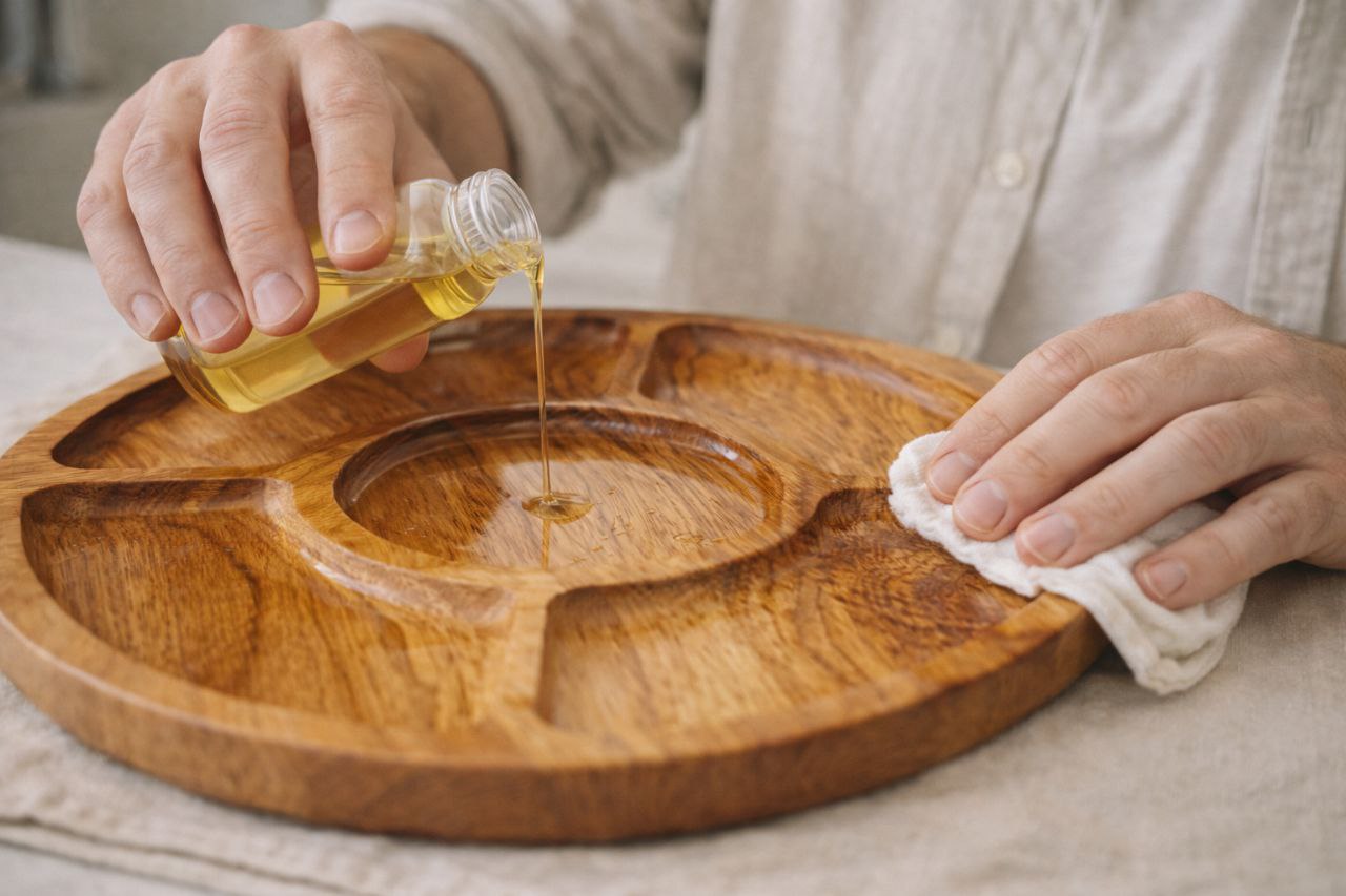 Если поверхность стала матовой «как мел», быстрее впитывает воду и появляется ощущение сухости — пора. Нанесите тонкий слой минерального масла, распределите по всей поверхности (включая торцы), оставьте впитаться и отполируйте сухой тканью.