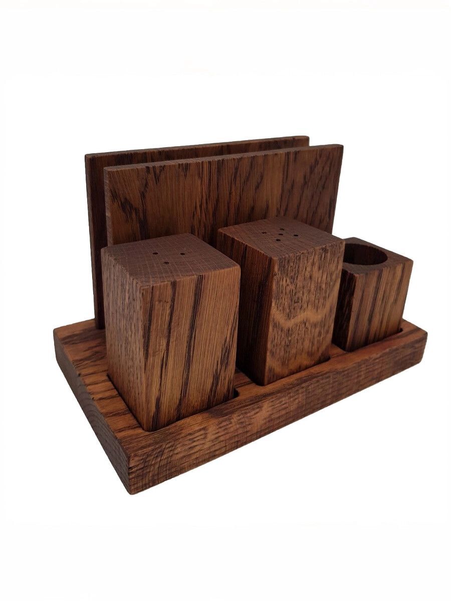 В комплект набора входит солонка, перечница, контейнер для зубочисток и держательница для салфеток. Грубый и изящный дизайн в стиле рустик позволит вам и вашим гостям приблизиться к природе, этому же поспособствует приятный аромат, который древесина дуба придаст специям. Кажется, что это лишь незначительный аксессуар, но не спешите недооценивать наш набор, ведь как говорил Рей Брэдбери: «…мелкие радости куда важнее крупных».